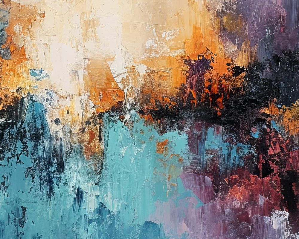 Jeu de couleurs du crépuscule | Horizon abstrait - Cette peinture abstraite dynamique combine des bleus froids avec des oranges et des rouges chauds, exprimant un horizon vibrant de couleurs. Les coups de pinceau larges et non structurés et la texture créent un jeu captivant d'ombres et de lumières, parfait pour un intérieur contemporain qui aurait besoin de couleurs.