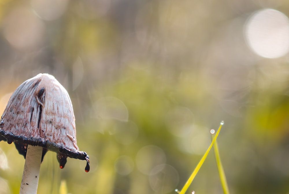 Image d'un champignon dans la lumière du petit matin avec un magnifique bokeh (boules de lumière) en arrière-plan. L'automne dans toute sa splendeur. Ceux qui zooment peuvent apercevoir un autre insecte sur le champignon.