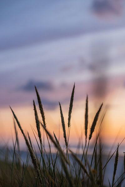 Couleurs du coucher de soleil dans les dunes d'Ameland. Quelle belle soirée sur la magnifique île des Wadden d'Ameland ! Le ciel s'est coloré de violet ! Magnifique avec cette herbe d'ammophile au premier plan.