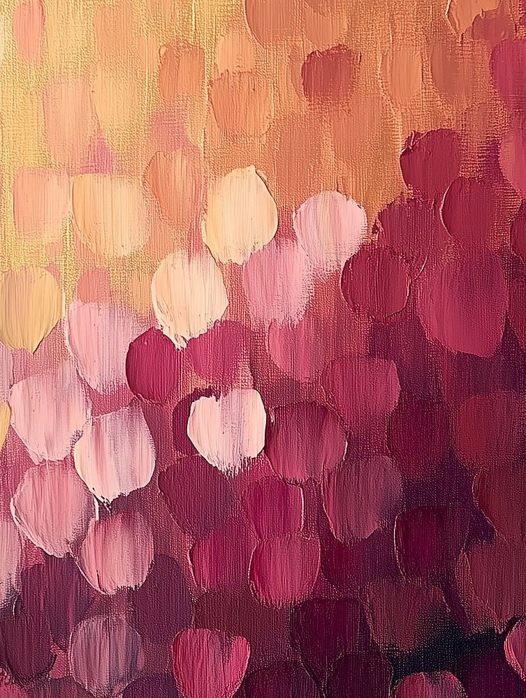Une peinture abstraite dans une palette fascinante de vert émeraude, de rose, de bordeaux et d'or. La composition est une danse ludique de formes ressemblant à des feuilles, mais sans contours clairs, avec des couleurs qui se fondent les unes dans les autres. Vues d'en haut, les couleurs sont d'abord claires et lumineuses, le vert émeraude remplissant doucement l'espace. Vers le bas, les nuances s'estompent pour laisser place à un bordeaux et un rose plus foncés, avec de subtils accents dorés qui traversent la toile comme une lueur mystérieuse. Le jeu des couleurs crée une impression de mouvement, comme un rythme visuel qui fait passer le regard de la lumière à l'obscurité, comme si le tableau lui-même respirait. Les feuilles abstraites semblent pousser, mais c'est la transition des couleurs et la profondeur captivante qui capturent l'essence de l'œuvre d'art. Abstrait moderne. Botanique.