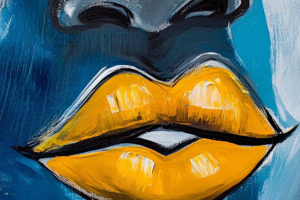 Un jeu fascinant de couleurs se déploie dans les tons bleus vifs et jaunes éclatants qui font rayonner les lèvres. La représentation audacieuse et artistique transmet une aura puissante et attire les regards comme par magie. Idéal pour le salon, pour stimuler les conversations et encourager la créativité.