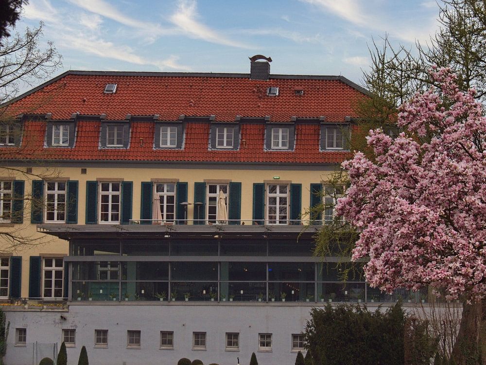 Vue à travers des buissons au-dessus d'un chemin pour la floraison des magnolias à Gelsenkirchen au château de Berge.