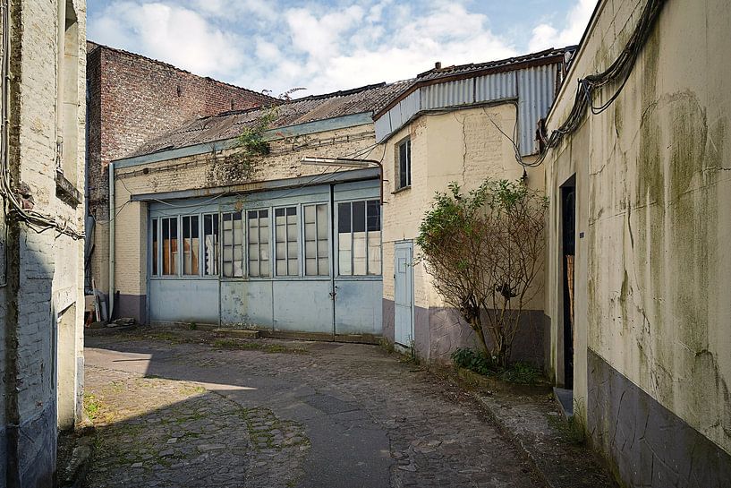 Une petite cour à Gand, avec des bâtiments vétustes, des murs écaillés et un passage étroit entre eux. Il y règne une atmosphère calme et déserte.