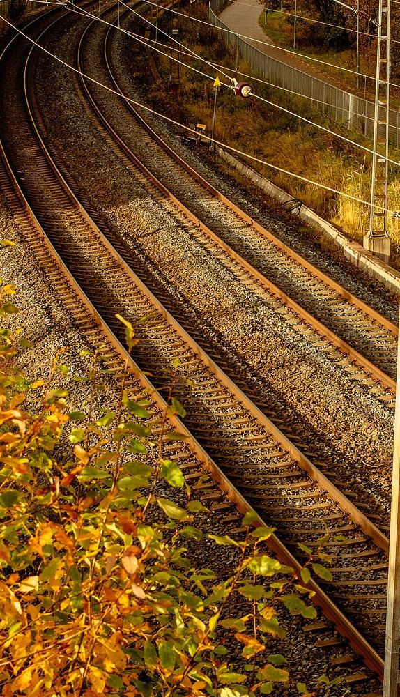 Voies parallèles serpentant parmi des arbres cuivrés, soulignées par des poteaux de caténaires. Rythme calme et lumière chaude.
