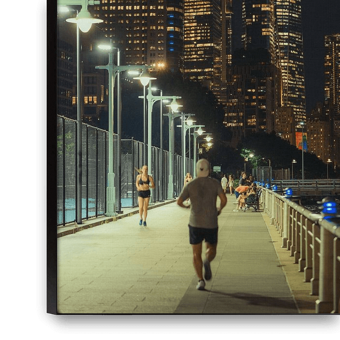 Achetez cette photo Coureur nocturne sur l'Hudson : Manhattan en lumière par NZME Photography sur toile, aluminium, ArtFrame ou photographie (encadrée), impression d'art en haute qualité et tout format.