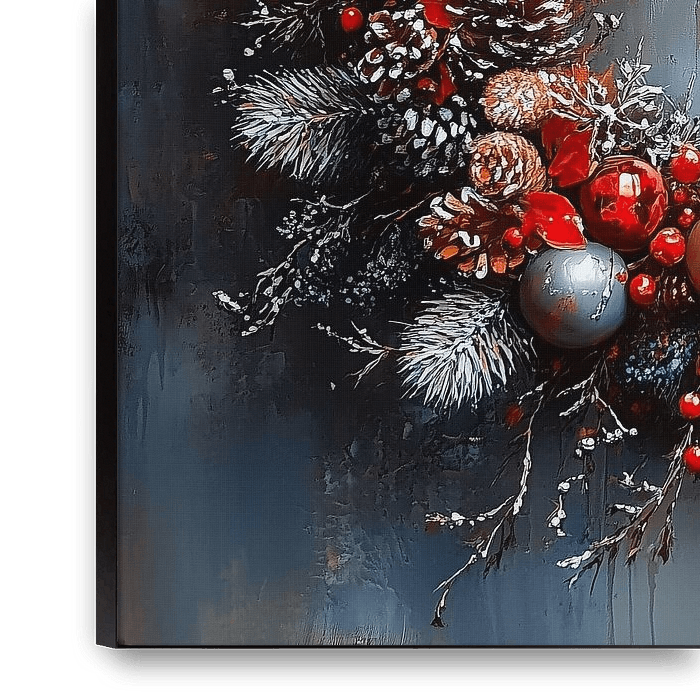 Couronne de Noël | Couronne de Noël - Cette peinture de Noël présente une grande couronne de Noël richement décorée comme sujet central - une peinture réaliste moderne avec des pommes de pin, des nœuds rouges, des boules brillantes et des baies rouges avec des accents de neige sur un fond bleu-gris, ce qui rend la peinture de Noël et la couronne de Noël immédiatement évidente.