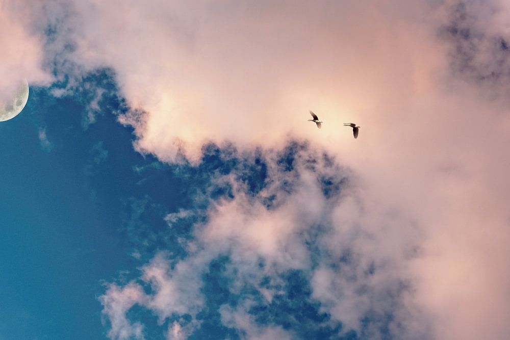 Couverture nuageuse rose et rêveuse. Un enregistrement réalisé dans la ville de Leeuwarden. 2 oies en vol. Un morceau de lune sur le huitième sol. Une belle lueur et une plus grande saturation des nuages les rendent tous un peu rêveurs et imaginatifs. Les bâtiments font partie de la ville de Leeuwarden.