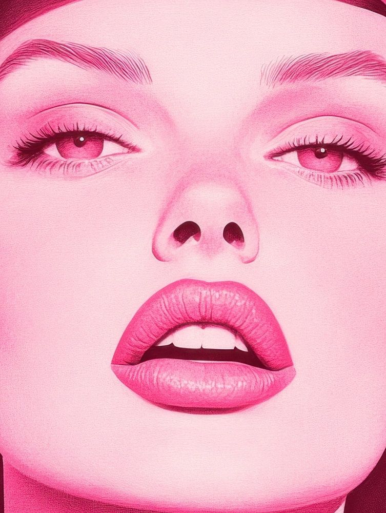 Cette image rappelle les images emblématiques des stars de cinéma du milieu du XXe siècle, mais avec une touche contemporaine grâce au choix des couleurs monochromes. L'œuvre dégage une puissance féminine, combinée à une touche de nostalgie et d'élégance sophistiquée, ce qui la rend à la fois moderne et intemporelle. La palette de couleurs roses renforce le sentiment d'espièglerie et de liberté.