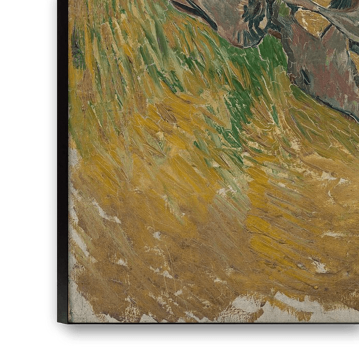 À l'aide d'un pinceau étroit et de peinture bleue, Van Gogh a tracé les contours du crâne. Il a alterné la peinture fine avec la peinture épaisse : pour la brillance du crâne, il a utilisé des taches de peinture claire. En de nombreux endroits, on peut voir des fissures de retrait dans la peinture, regardez par exemple la zone juste en dessous du crâne. C'est parce que Van Gogh a peint la tête par-dessus une représentation antérieure. Il l'a d'abord recouverte d'une couche de blanc de zinc, un type de peinture qui sèche très lentement. Ce processus de séchage s'est poursuivi après que le crâne a été peint par-dessus, provoquant les fissures dans la couche supérieure de peinture.