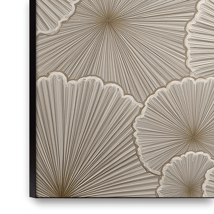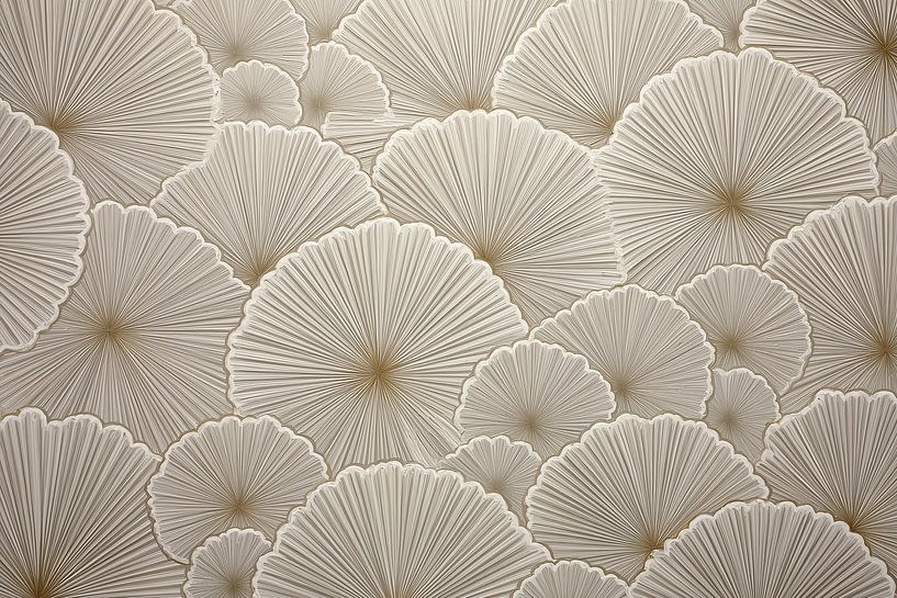 Crème Waaiers - Il s'agit d'une peinture abstraite représentant de grandes formes de coquillages crème et beiges qui se chevauchent, avec de fines lignes rayonnantes et des centres dorés subtils, une peinture abstraite moderne et apaisante, une peinture abstraite adaptée à la décoration intérieure.