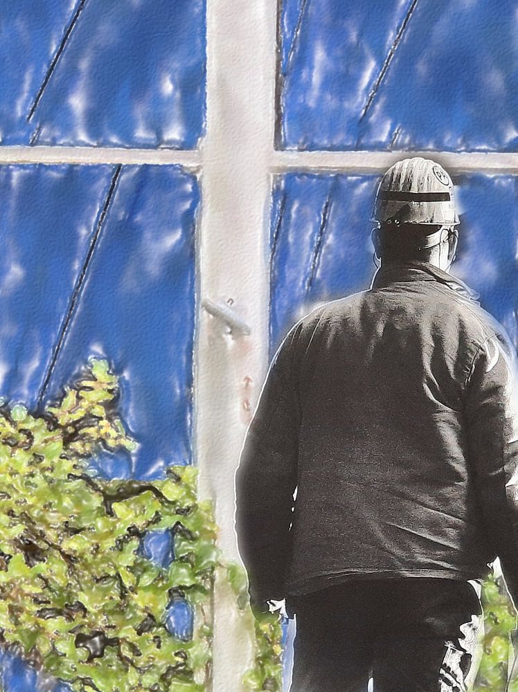 Le mineur s'en va. Photomontage d'une photo noir et blanc d'un mineur avec une photo couleur d'une vieille fenêtre
