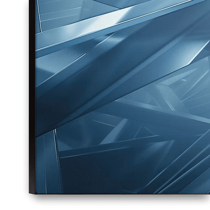 Une représentation abstraite de barres chatoyantes qui se croisent dans des tons bleus froids. La superposition des éléments géométriques crée de la profondeur et de la complexité, tandis que la lumière qui traverse les structures donne un effet presque cristallin. La composition est à la fois futuriste et minimaliste, avec une…