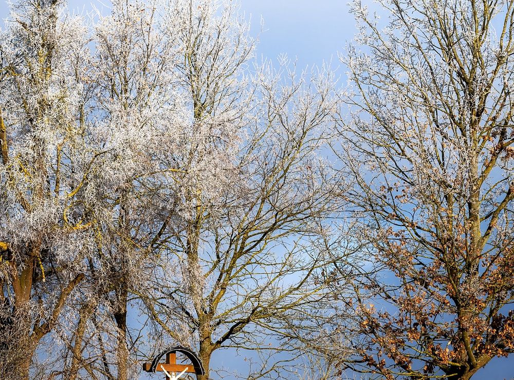 Croix de campagne entre des arbres gelés à Schrobenhausen (Bavière)