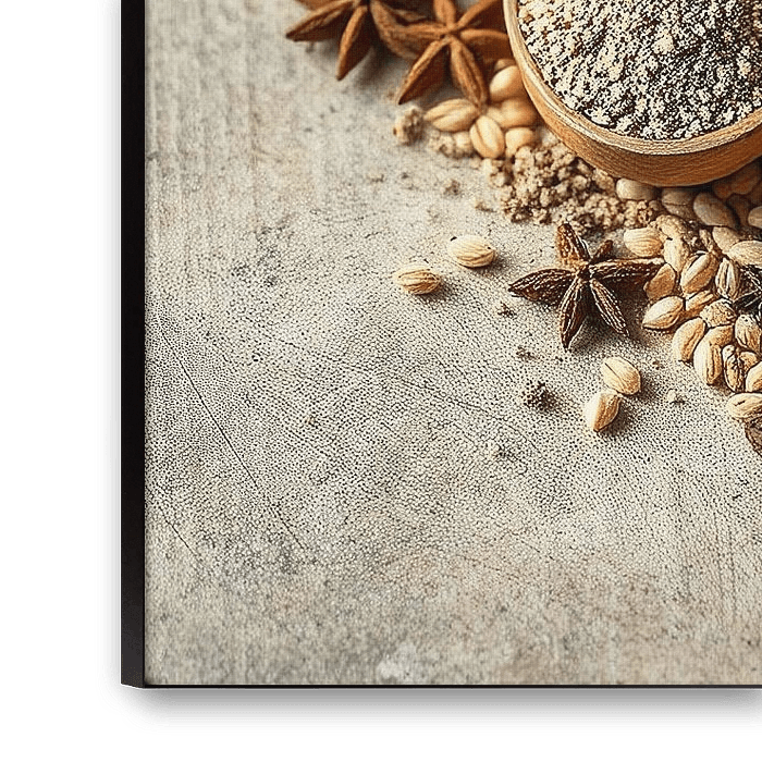 Plusieurs cuillères fabriquées à la main sont posées harmonieusement sur une table en bois brut. Chaque cuillère porte la marque de sa personnalité - de petites irrégularités et des veinures individuelles leur confèrent caractère et unicité. Les cuillères sont habilement disposées avec des épices. Cette disposition n'inspire pas seulement la cuisine, elle stimule aussi l'imagination - quel goût pourrait naître de ce mélange harmonieux ?