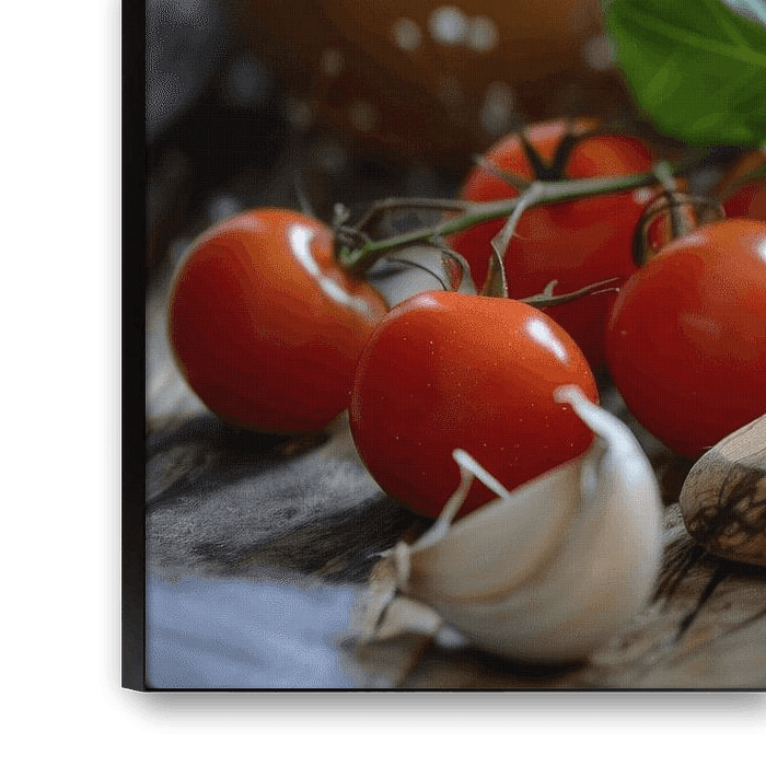 Cette nature morte riche en détails montre une botte de spaghettis sur une planche à découper rustique, entourée d'ingrédients frais comme des tomates, du basilic et de l'ail. La disposition soignée et les couleurs naturelles font de ce tableau une pièce de décoration parfaite pour les cuisines et les salles à manger. Idéal pour les gourmets et les amateurs de cuisine méditerranéenne qui souhaitent enrichir leur espace d'une touche d'art culinaire.
