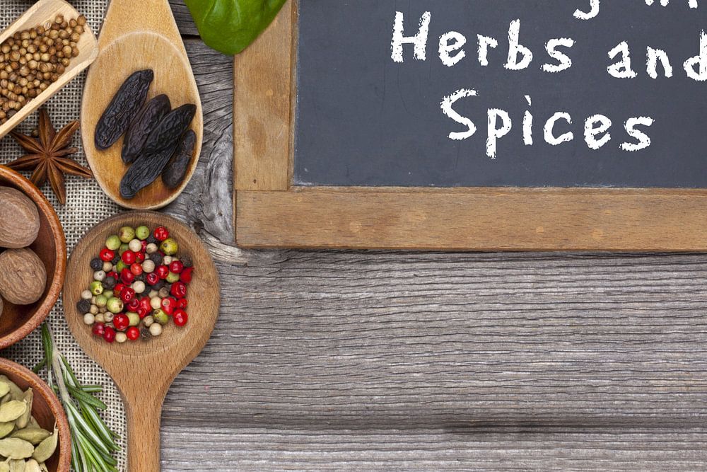 Diverses herbes et épices sur des cuillères en bois et dans des boîtes sur un fond en bois rustique avec une planche en ardoise et le texte: Cuisiner avec herbes et épices.