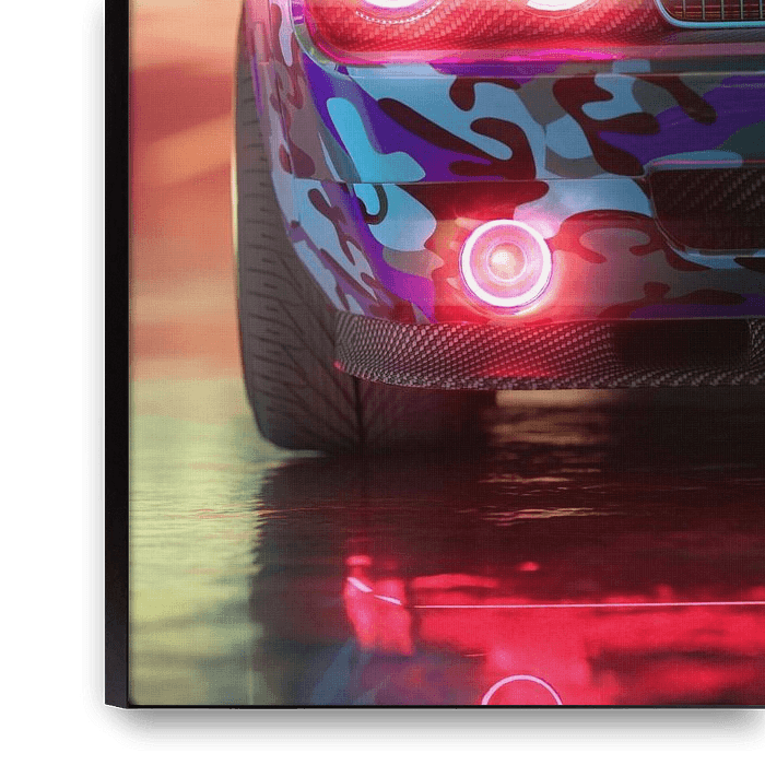 Gros plan sur une Dodge Challenger arborant un habillage « Cyber Camo » extravagant. Les phares rouges lumineux et les détails en fibre de carbone prononcés donnent à cette voiture musclée l'allure d'un prédateur high-tech.