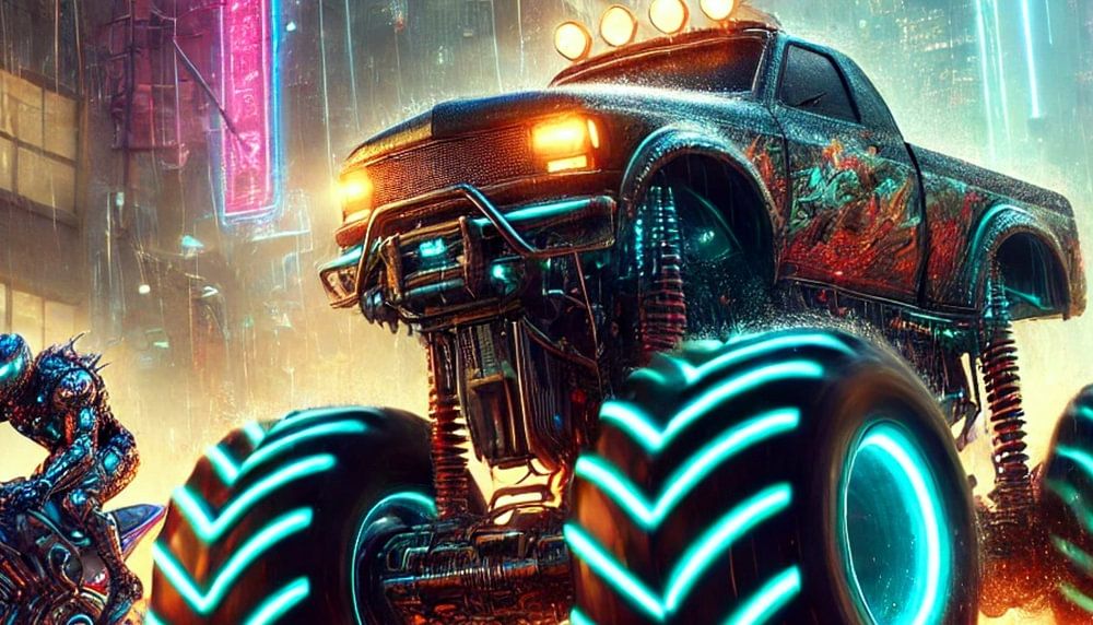 A propos de "Cyberpunk Monster Truck Glowing Wheels"