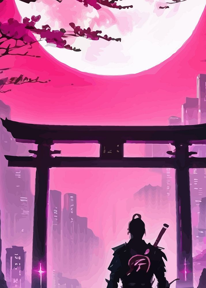 Cyberpunk Warrior avec Torii Gate et Moon