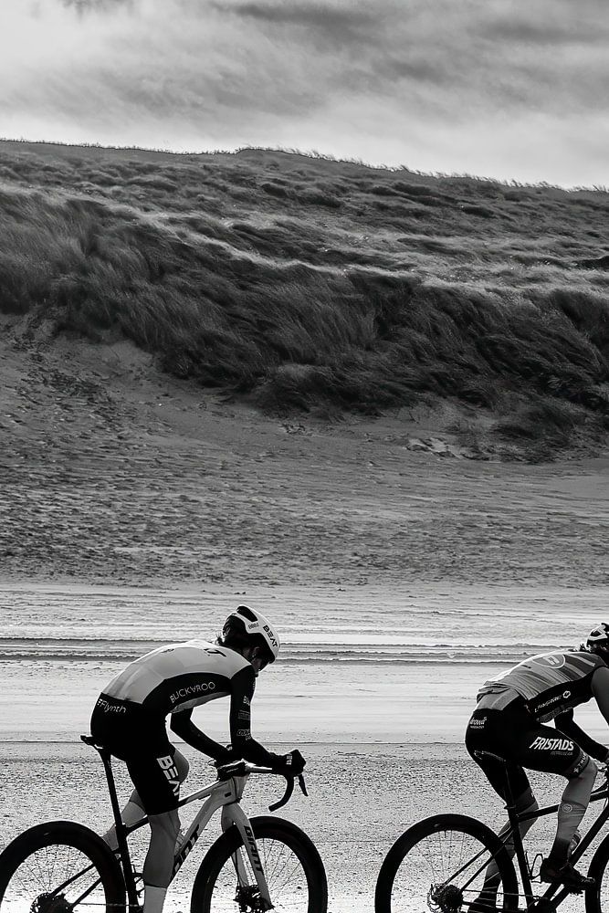 Lors d'une course de plage à Noordwijk, ces cyclistes roulent près de la ligne d'eau, créant des reflets. Photo en noir et blanc.