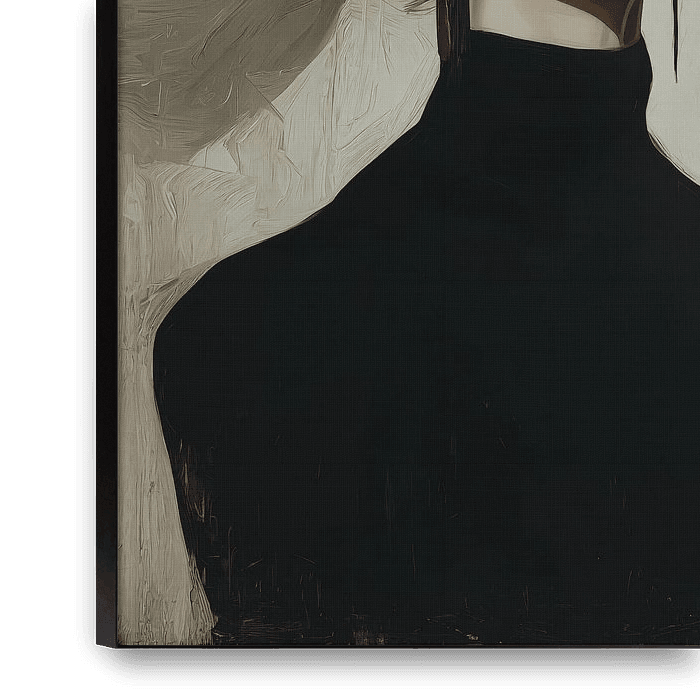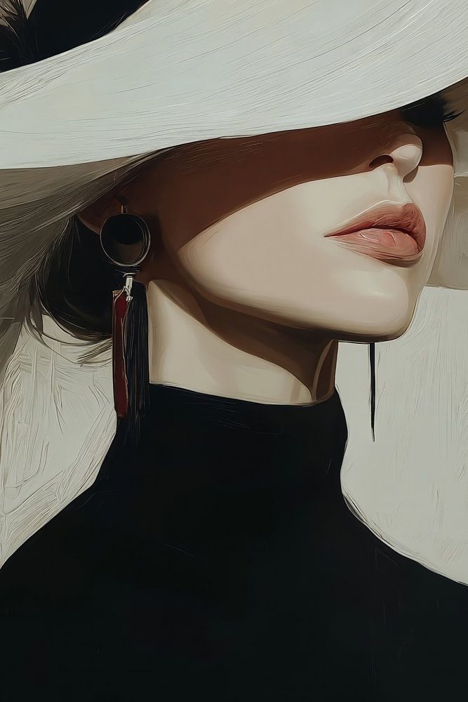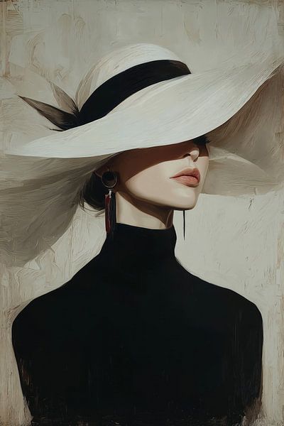 Portrait d'une femme coiffée d'un grand chapeau blanc à ruban noir, dissimulant partiellement son visage. L'esthétique haute couture est rehaussée par son col roulé noir et ses boucles d'oreilles imposantes, tandis que la technique picturale stylisée et discrète exhale une élégance intemporelle. Cette œuvre joue avec brio sur les…
