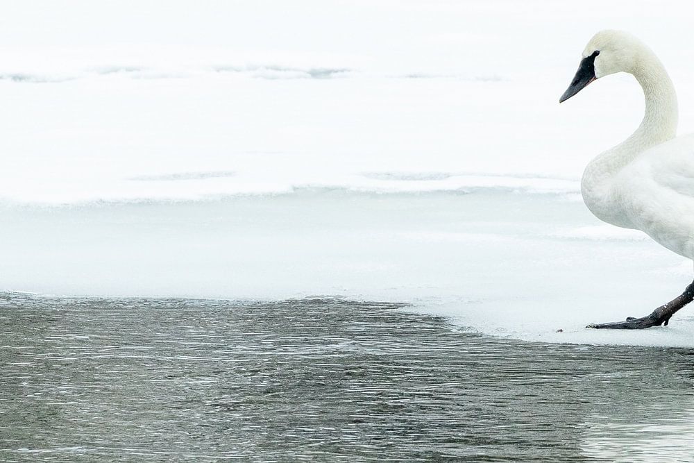 Vous pouvez voir de nombreux animaux aux ouvertures dans la glace. À la recherche de nourriture, comme ce petit cygne qui marche prudemment sur la glace pour se rendre à l'eau.