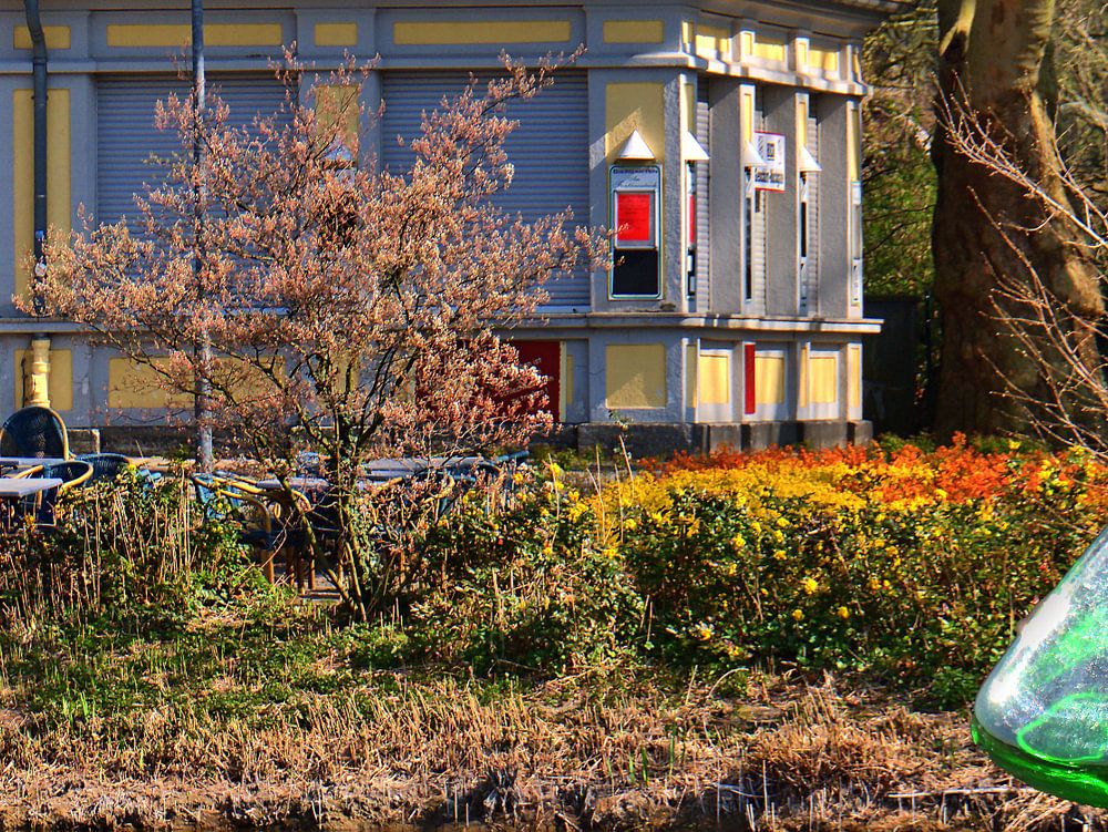 Étang du château dans le jardin à bière du château de Berge à Gelsenkirchen avec photomontage d'une pyramide de verre