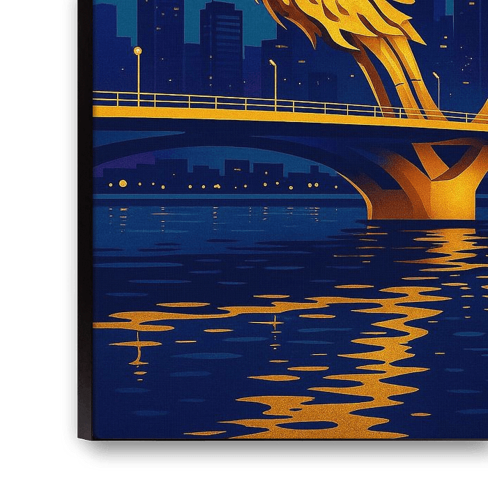 Derrière le pont s'élève une ligne d'horizon à couper le souffle, remplie de gratte-ciel élégants, de fenêtres lumineuses et de tons nocturnes d'un bleu profond qui soulignent l'identité moderne de la ville. La réflexion des lumières sur la surface calme de la rivière crée un jeu dynamique de couleurs - l'or se fondant dans l'indigo - donnant à l'œuvre d'art un aspect radieux et énergique.