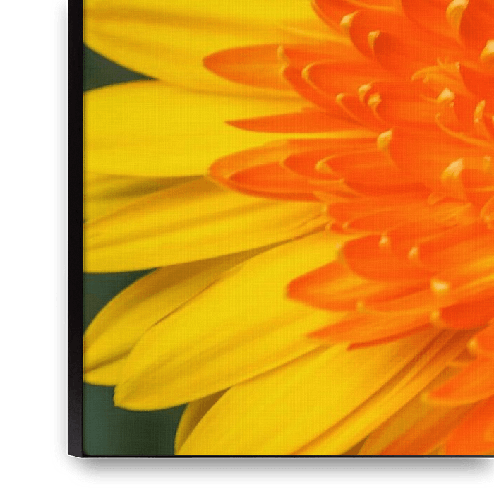 Deze dahlia valt goed op door zijn felle gele en oranje kleuren. De felle kleuren zijn een echte eyecatcher aan uw muur.