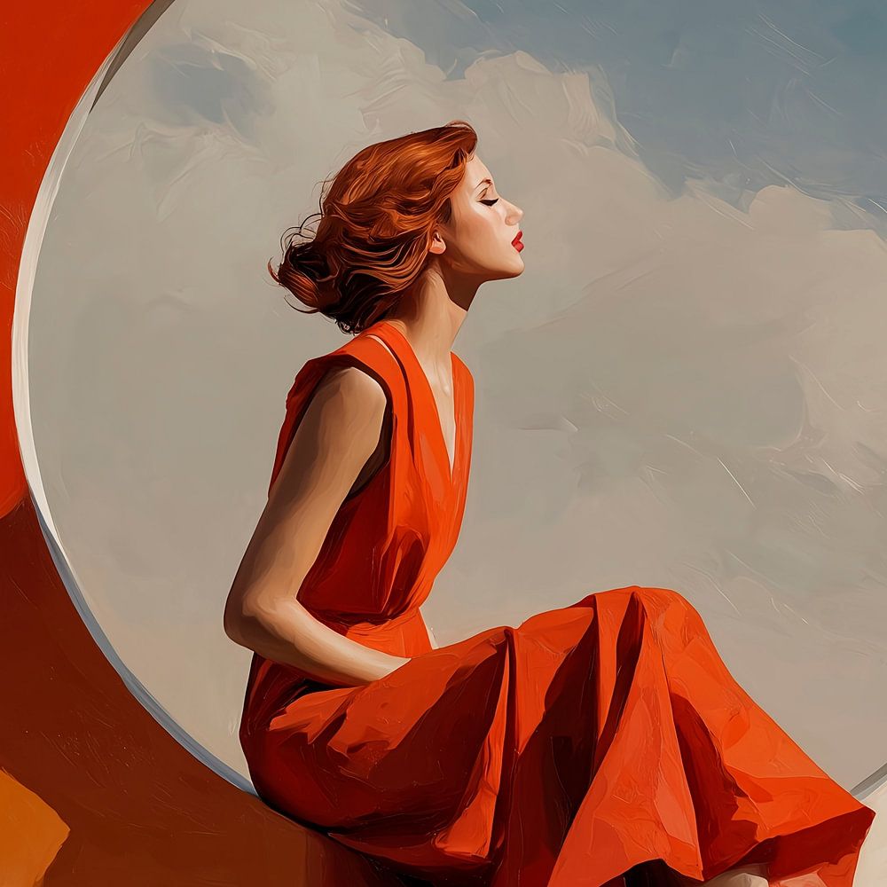 Une œuvre d'art représentant une femme vêtue d'une robe rouge, assise gracieusement dans un renfoncement circulaire qui révèle un ciel bleu doux avec des nuages. Ses cheveux châtains sont élégamment coiffés et elle a l'air pensive, dégageant une atmosphère sereine et artistique.