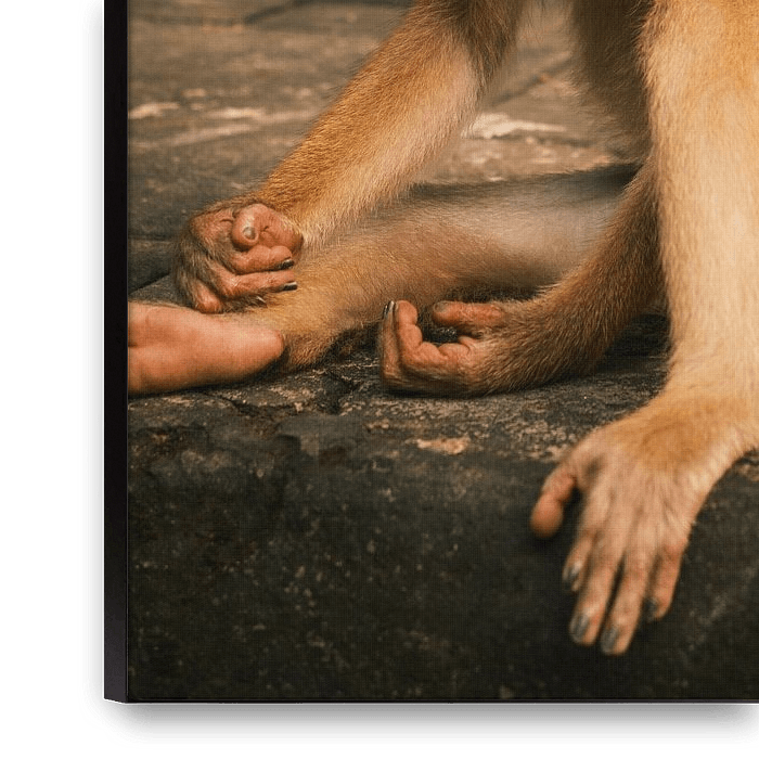 Cette image montre un macaque assis sur un sol en pierre, profitant du calme de l'environnement tropical. Les membres puissants et le pelage doré reflètent la vitalité et la capacité d'adaptation typiques de ces primates. Le contraste entre la lumière du soleil et l'ombre souligne la structure du pelage et met en valeur l'élégance…