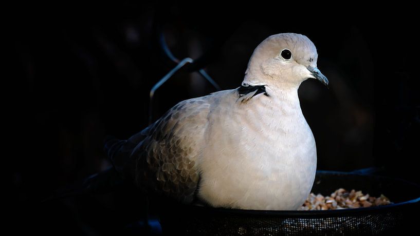Cette tourterelle turque est confortablement assise dans le bol de nourrissage dans le jardin. Cette coupelle est suspendue à une perche d'alimentation d'environ 150 centimètres de haut, et la lumière du soleil de l'après-midi brillait comme un projecteur juste sur le poitrail, laissant les alentours dans une obscurité relative. Cette…