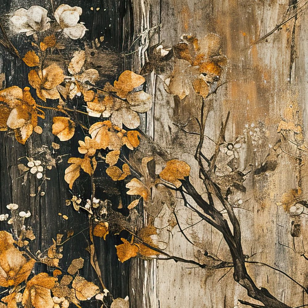 Détails : floral, nature, tons de terre, ocre, beige, noir, blanc, gris, mystique, élégant, Natural living