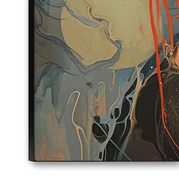 Golden Dance - Le dynamisme de cette œuvre d'art abstraite panoramique réside dans son mélange vibrant de textures et d'éléments superposés, où les formes circulaires organiques et les lignes ondulantes sont ornées d'une riche palette de tons marine, or et terreux, accentués par des rouges flamboyants. Les éclaboussures dorées apportent une touche luxueuse et chaleureuse à tout intérieur moderne, tandis que de subtiles touches de turquoise apportent un contraste frais.
