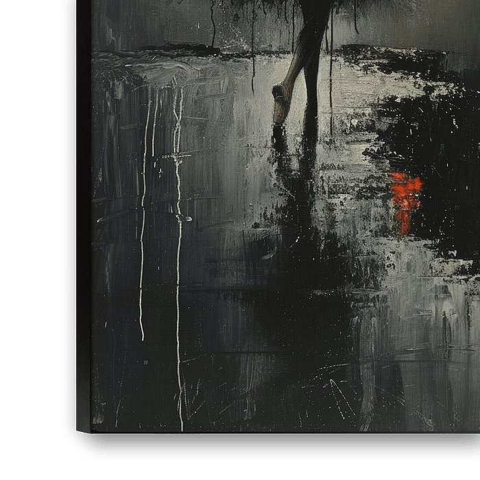 La ballerine est au premier plan, sa silhouette sombre et mystérieuse se détachant sur l'arrière-plan d'un environnement brumeux subtilement éclairé. L'environnement est enveloppé de tons neutres et sombres, avec l'utilisation prédominante du noir et du gris, ce qui donne une impression de profondeur et de texture. Au centre de l'œuvre se trouve une tache rouge unique et frappante qui ressemble au soleil ou à son reflet. Cet élément crée un contraste dynamique avec les tons sombres prédominants et suggère une source de lumière et de chaleur au loin. La ballerine, prise dans un moment d'introspection, semble se détourner de l'obscurité et se diriger vers cette lumière. La réflexion de la lumière rouge sur la surface aqueuse en contrebas ajoute une autre couche à la peinture et crée un sentiment de mouvement et de changement.