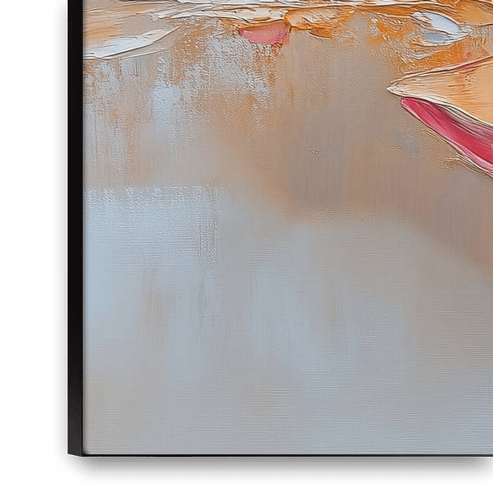Cette peinture abstraite représente la beauté élégante d'une fleur, dont les pétales délicats sont faits de fils d'or dans des tons subtils de rose et d'orange, sur un fond crème doux. La composition capture le mouvement dynamique des pétales, comme s'ils dansaient dans le vent, créant un sentiment de fluidité et de grâce. Les coups de pinceau à la peinture à l'huile confèrent à l'œuvre une texture raffinée, donnant vie au mouvement et à la douceur de la fleur.