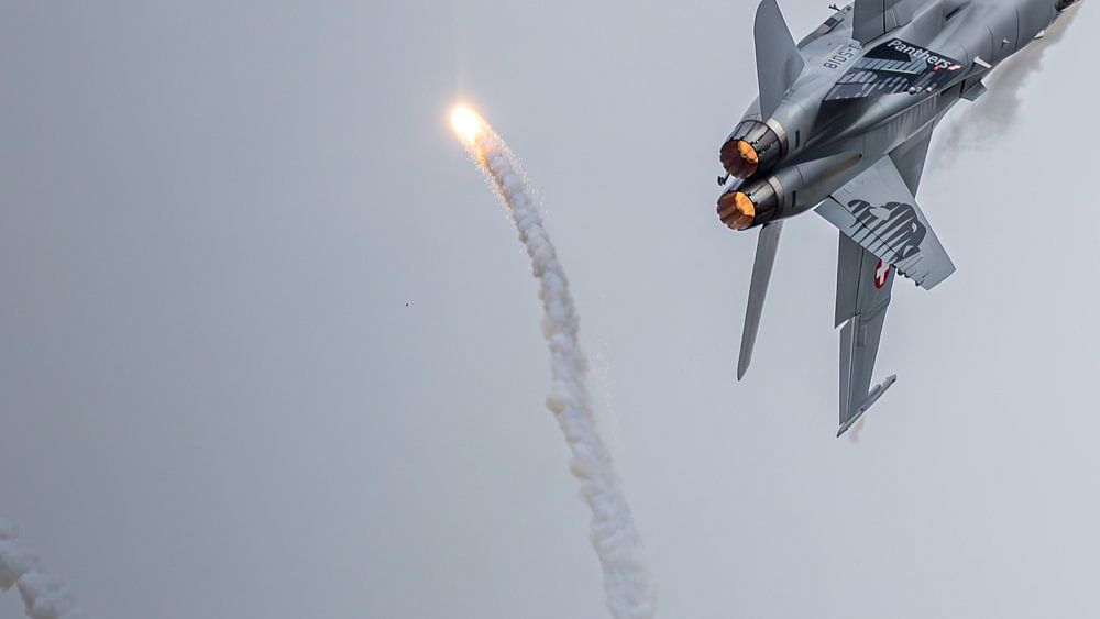 Capturée dans un spectacle d'acrobatie aérienne à couper le souffle, cette image montre un chasseur à réaction exécutant une manœuvre d'évasion spectaculaire sous la menace de missiles entrants. Alors qu'il fend le ciel, l'avion libère une rafale de fusées éclairantes, créant un motif lumineux envoûtant sur la toile de fond sombre du ciel ouvert. Ces fusées brûlent intensément, tissant un rideau de feu protecteur destiné à détourner l'intention meurtrière du missile. La photographie capture ce moment critique avec une clarté intense, soulignant le contraste saisissant entre le brillant métallique de l'avion et l'éclat chaotique des fusées éclairantes. Il s'agit d'un portrait puissant du ballet de la guerre moderne, où la technologie et l'habileté humaine se combinent dans une danse de vie ou de mort.