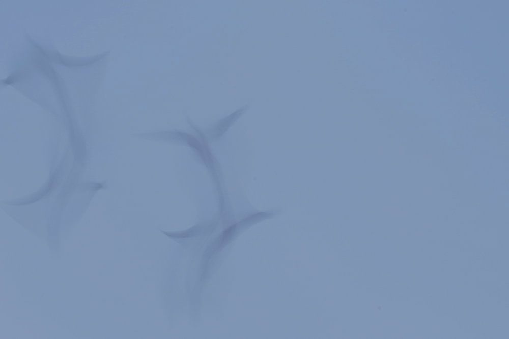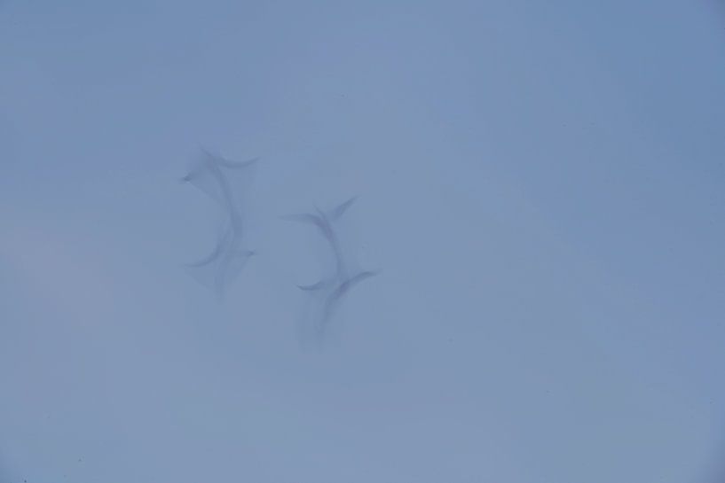 Sur cette belle œuvre apaisante, vous pouvez voir un beau ciel bleu avec deux oies en vol. Grâce à une vitesse d'obturation légèrement plus longue, vous pouvez voir à quel point elles se déplacent gracieusement haut dans le ciel. On dirait qu'elles dansent dans les airs.