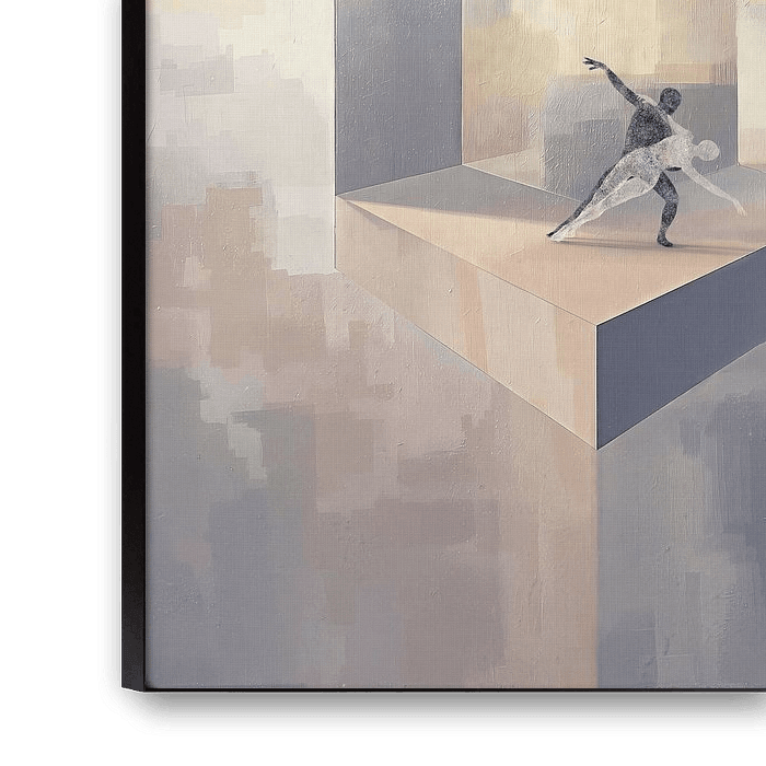 La composition est soigneusement construite autour de l'équilibre, de la lumière et du mouvement. Les tons doux de gris, de beige et de blanc renforcent l'aspect minimaliste, tandis que les danseurs ajoutent un élément humain qui apporte chaleur et émotion à un paysage par ailleurs presque architectural.