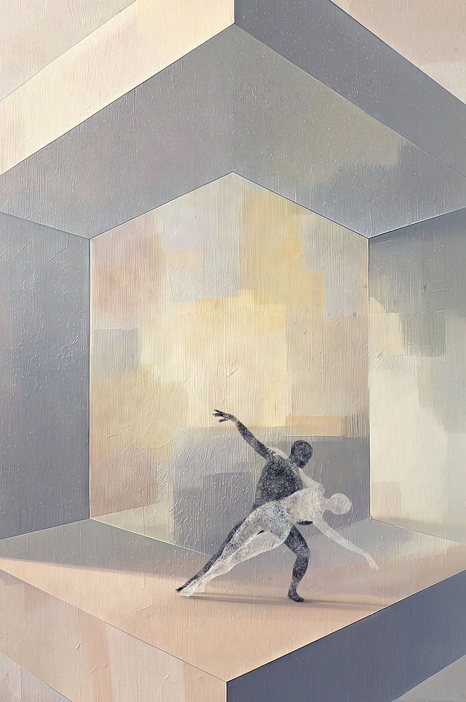 Dans Dancing in Geometry, le monde des formes rigides et de l'architecture minimaliste rencontre la grâce et l'énergie de la danse. L'œuvre montre une construction géométrique qui semble en équilibre entre l'ordre et l'abstraction. À l'intérieur de cette forme parfaitement alignée, deux danseurs se déplacent - semi-transparents, composés de lignes fluides et d'ombres subtiles. Leur dynamisme rompt l'équilibre silencieux de l'espace, créant simultanément tension et harmonie.