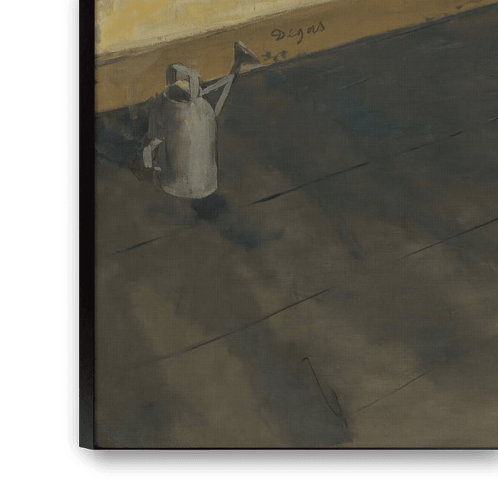 Dancers Practicing at the Barre" ; est une célèbre peinture à l'huile du maître impressionniste français Edgar Degas, réalisée en 1877. Cette œuvre d'art capture un moment candide, dans les coulisses d'un studio de ballet, mettant en scène deux ballerines effectuant des exercices d'étirement à une rampe en bois. La composition est célèbre pour son cadrage asymétrique et sa perspective surélevée, avec une vue plongeante sur une vaste étendue de planches en bois qui domine le premier plan. À l'extrême gauche, un arrosoir en métal gris est posé sur le sol, un détail historique spécifique représentant l'outil utilisé pour mouiller le bois afin d'empêcher les danseurs de glisser.