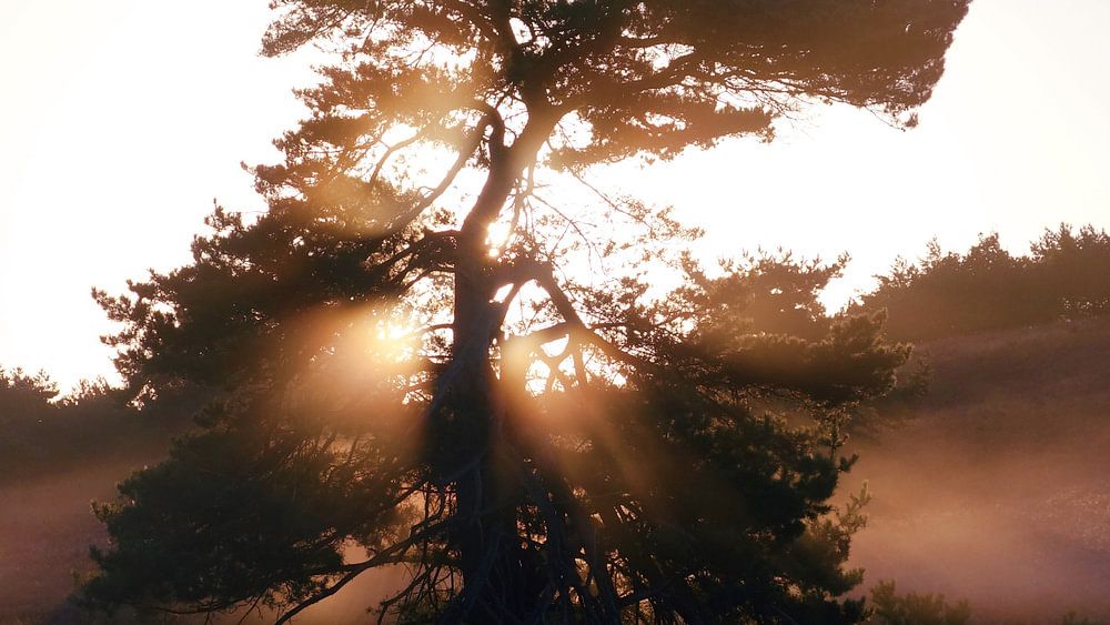 Nevel en zon in de vroege ochtend op de heide gaven een bijzonder licht aan deze boom