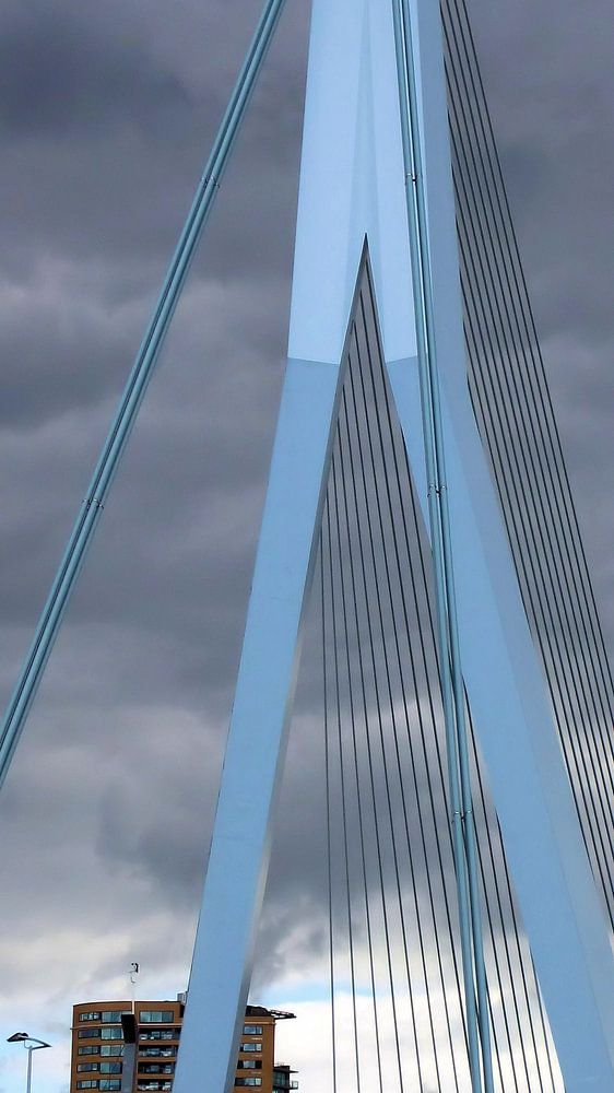 DeErasmusbrug in Rotterdam. onheilspellende wolken drijven over de stad. Een regenbui is in de maak. Het verkeer rijdt langzaam richting het centrum.