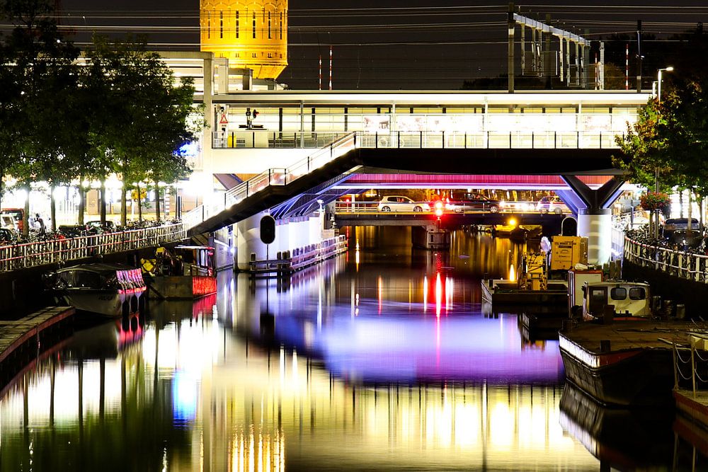 Een nachtfoto gemaakt met lange sluitertijd, van de Vaartsche Rijn, die vanaf de singel richting hoograven loop. In beeld zijn het fel verlichte Station Vaartsche Rijn en de Watertoren, die mooi spiegelen in het vlakke water.