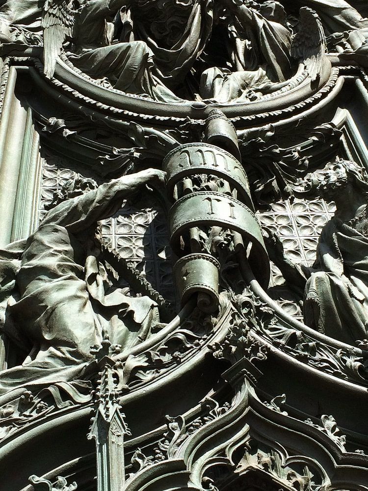 Op deze foto zien we de handbewerkte deur van de dom in Milaan. Op deze foto zijn allerlei kleine details van deze deur te zien. De illustraties op de deur zijn een mooie weergave van deze Katholieke kerk.
