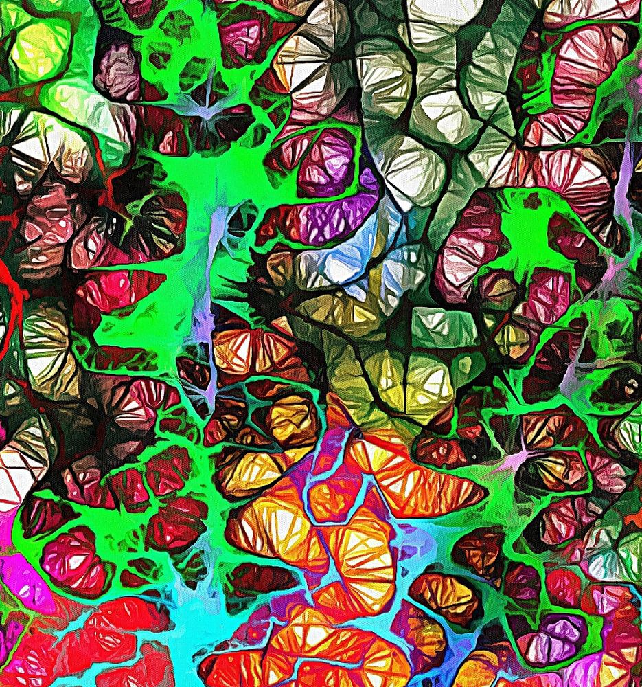 Juste pour le plaisir, une pièce conçue à l'aide du logiciel Scribbler Too en utilisant uniquement mon index droit ! J'ai imaginé une section d'une bordure de fleurs avec de grands glaïeuls roses et violets et des fleurs rouges en dessous, le tout dans un pot noir dans le jardin et j'ai produit l'image originale From the Flower Border. J'ai ensuite pris l'image et utilisé un logiciel numérique pour rehausser les couleurs. Dans cette version, j'ai spécifiquement ajouté plus de vert et de bleu à l'image afin de produire un effet de toile d'araignée.
