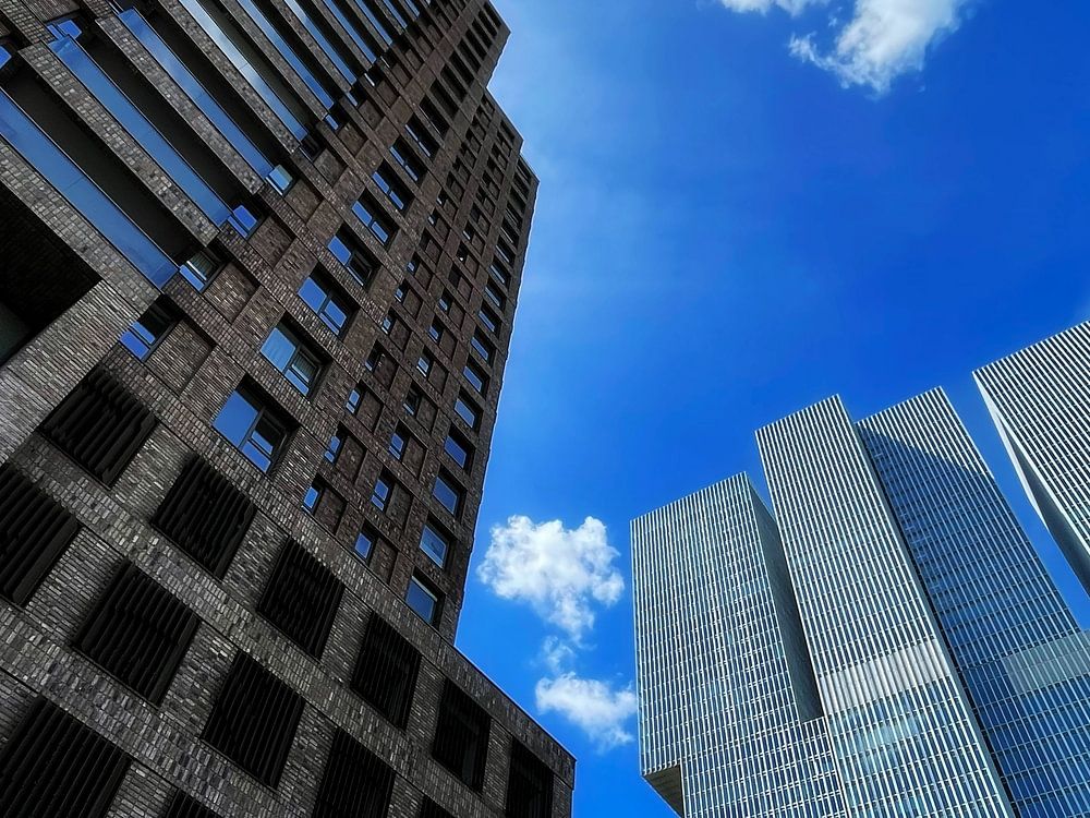 Debout sur le quai de Kop van Zuid, j'ai pointé mon objectif presque perpendiculairement vers le haut. À gauche s'élève une tour résidentielle en briques sombres, à la structure rugueuse et rythmée ; à droite brille l'emblématique complexe de verre "De Rotterdam", aux lignes pures et argentées. Le contraste ressemble à un dialogue entre le passé et l'avenir : une architecture portuaire robuste et des gratte-ciel ultramodernes. Un nuage solitaire flotte dans le zénith bleu vif du printemps, posant un léger coup de pinceau sur les lignes épurées.