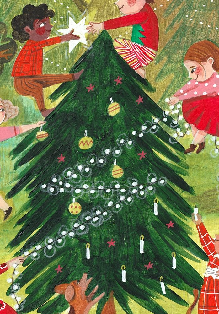 Une illustration adorable pour créer une atmosphère de Noël supplémentaire dans la chambre des enfants. Un village nordique avec de nombreux arbres de Noël, où un arbre de Noël est décoré par les enfants des maisons environnantes. Les chiens aident à installer les lumières de Noël. Beaucoup de vert avec des accents rouges et roses, pour un Noël classique. Peinture acrylique originale sur papier.
