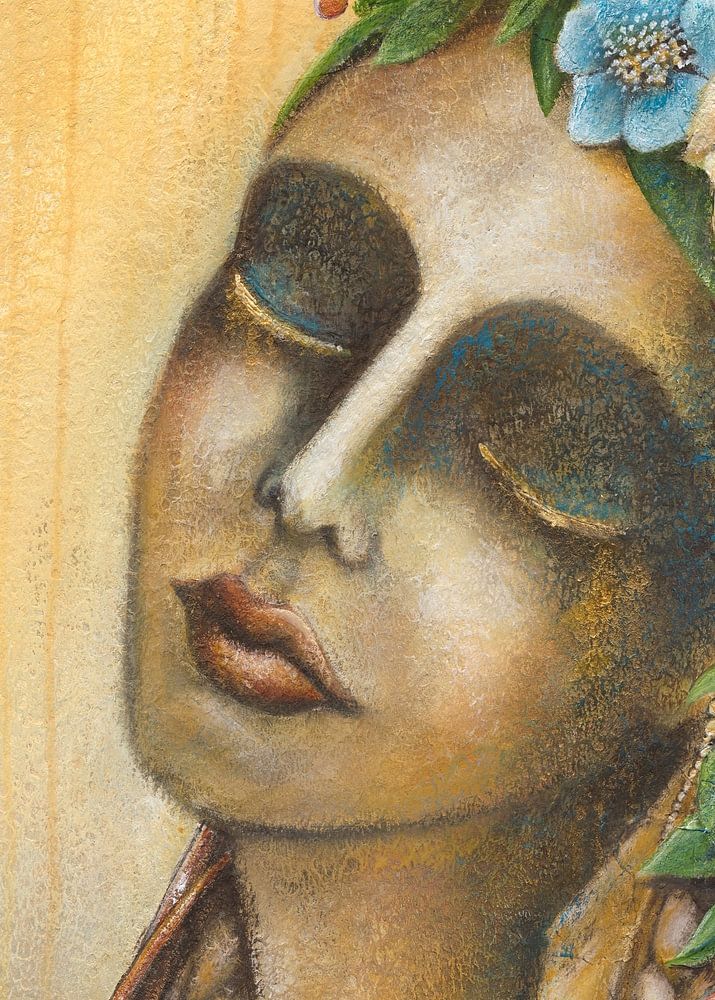 Elle porte les tresses qui portent le symbolisme de la fertilité ; des fruits acquis grâce à la plongée en haute mer pour les perles noires intérieures... Elles coulent en douceur le long de son cou, où se trouve le centre de la gorge, les vertèbres, à travers lesquelles le véritable pouvoir de manifestation s'écoule par nos actions, nos mouvements, notre respiration, les vibrations et les tons de notre voix, par nos mains dans toutes nos actions : comment nous touchons, effleurons, aimons, caressons, retenons quelque chose pour un temps indéfini - et le relâchons à nouveau.....