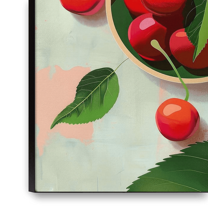 Le contraste entre les cerises éclatantes et les feuilles calmes crée un ensemble dynamique mais harmonieux.